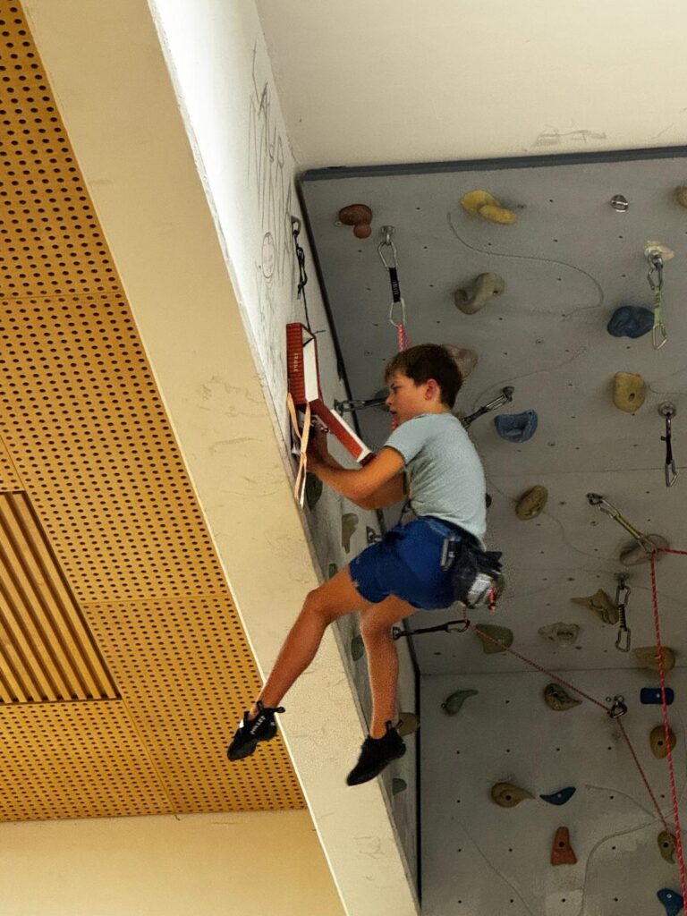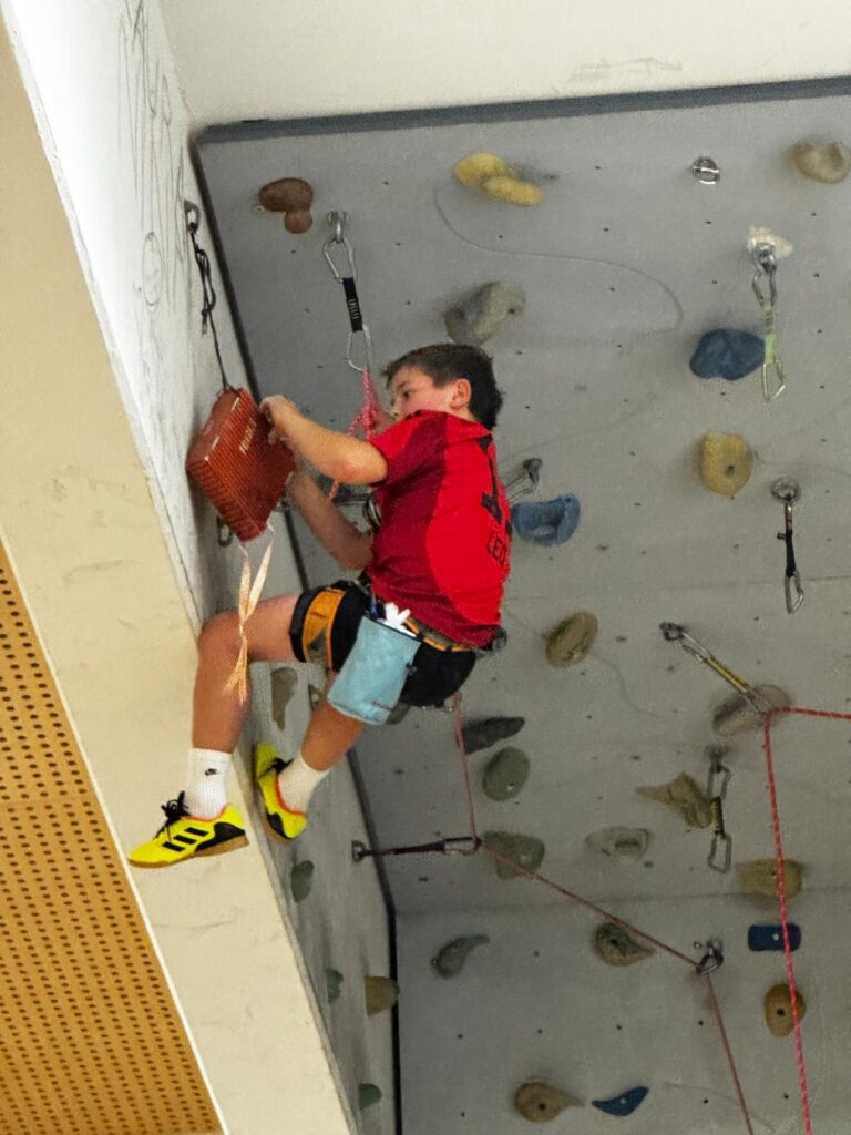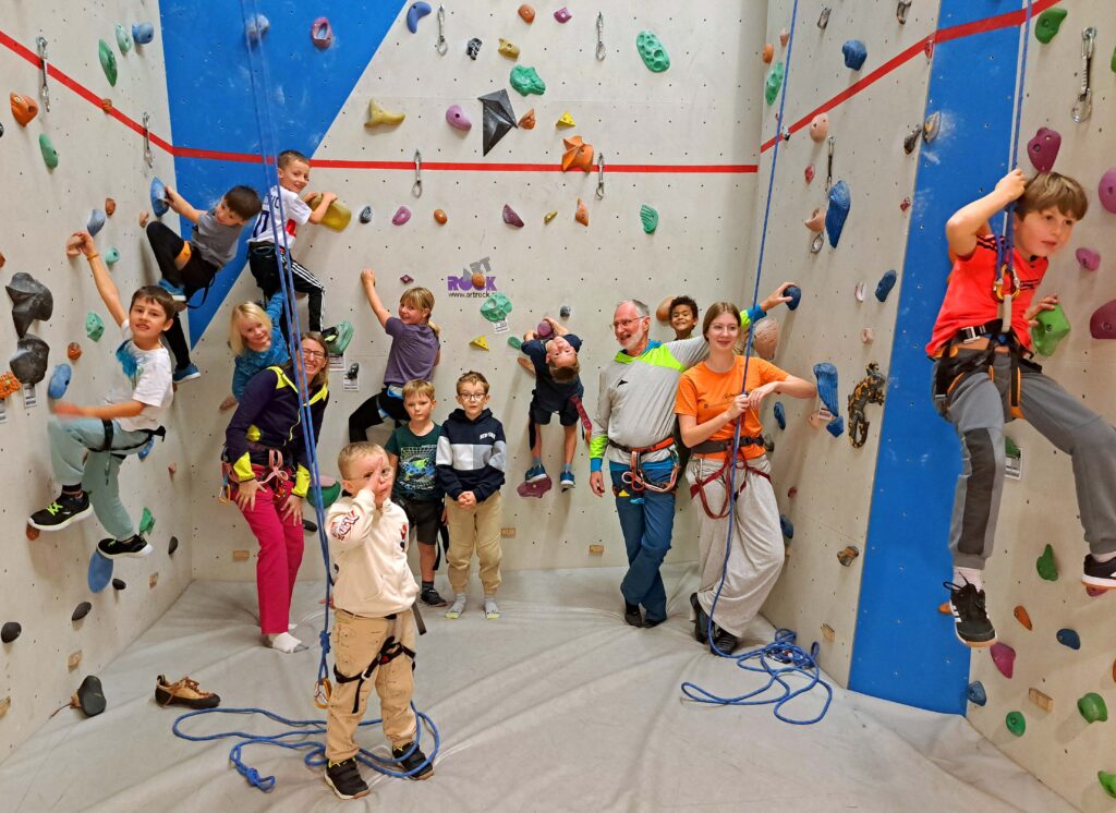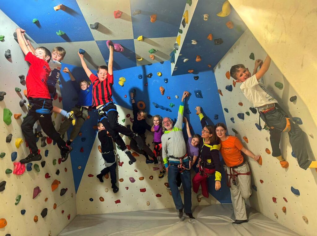 Einmal wöchentlich trafen sich 24 Kinder- und Jugendliche in zwei Gruppen zu unseren Kletterkursen im Turnsaal der Volksschule Dölsach zum Klettertraining. Nach Bewegungsspielen und Aufwärmübungen wurde bei bodennahen Boulderquergängen erst die Klettertechnik verfeinert, um anschließend beim Topropen in verschiedensten Schwierigkeitsgraden in die Praxis umgesetzt zu werden. Unter begeistertem Anfeuern und großem Applaus schafften Leo und Jakob es sogar, das Wandbuch der schwierigsten Route zu erreichen. Als krönender Abschluss kletterten unsere Kids in der Kletterhalle der Sportunion Nikolsdorf eine Reihe neuer Routen. Als ungebetene Zaungäste wurden die Nikolsdorfer Krampusse hinterm Oberlichtenfenster angesichts der kühnen Leistungen unserer jungen Kletterer ihrerseits in Angst und Schrecken versetzt.